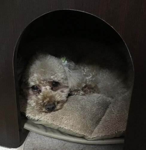 こんにちは、えびょです。 雷の大きな音が家にまで響いてきます。 トイプードルのケイスケはすっかり怯えてハウスに引きこもってしまいました。 私もこれから出かけないといけないので、早く雨雲がすぎてくれるといいのですが。 すっかり情けない顔になって…